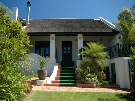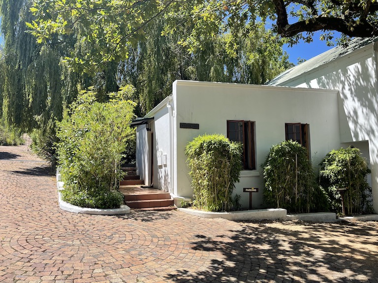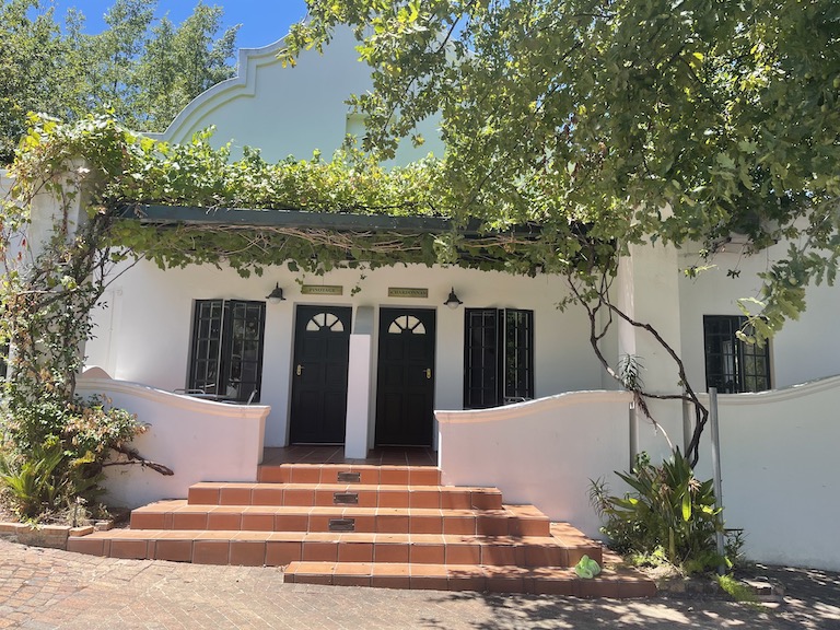 A stunning entrance that has a Cape Dutch look with a trellised vine patio and a wine region reflection.